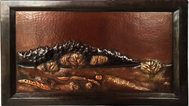Copper Murals & Cabinet Panels                        Standard Size: 24″ L x 16″ H.    Shown In Dark Patina Background With Golden Bronze Designs